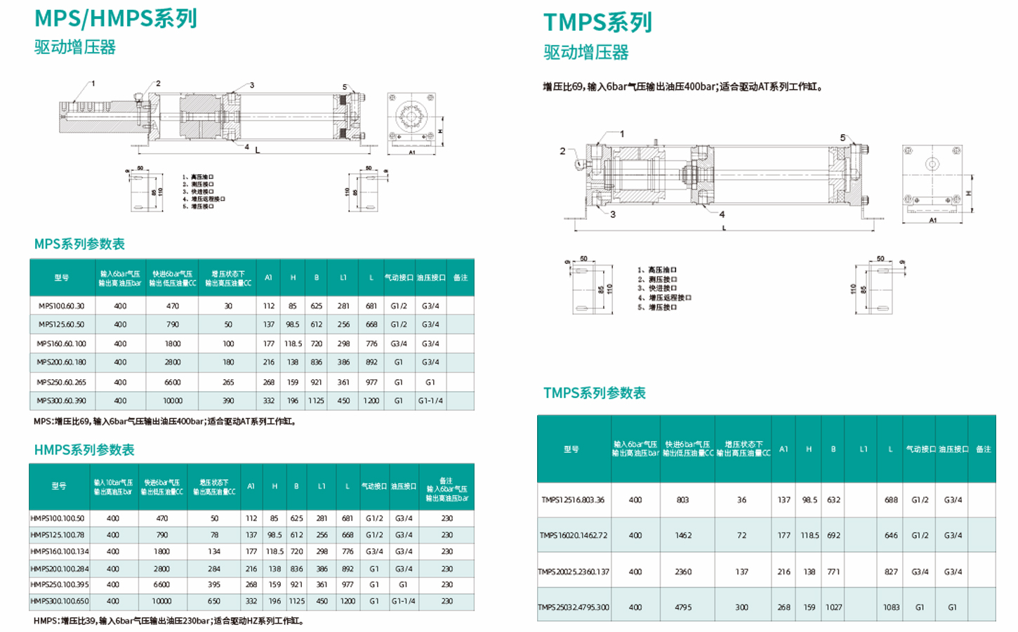 MPS:增压比69,输入6bar气压输出油压400bar;适合驱动AT系列工作缸 HMPS:增压比39,输入6bar气压输出油压230bar;适合驱动HZ系列工作缸 增压比69,输入6bar气压输出油压400bar;适合驱动AT系列工作缸